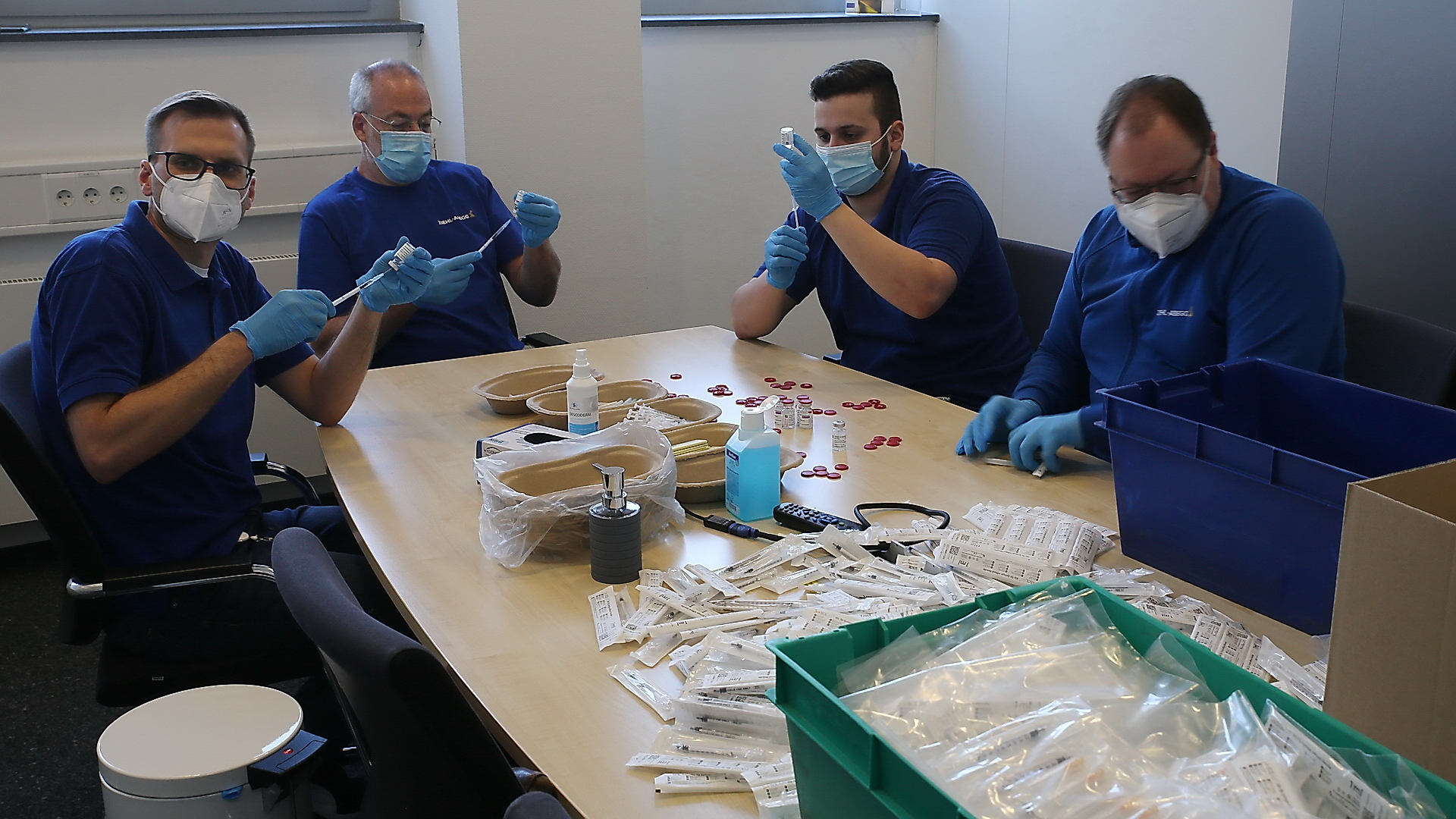 30. Mai 2021 – Impfaktion bei ZA: Hinter den Kulissen: Roland Burgemeister, Peter Schippert, Nicolas Grill und Holger M.Rößler (v.links) bereiten Impfdosen vor. Foto: GSCHWÄTZ