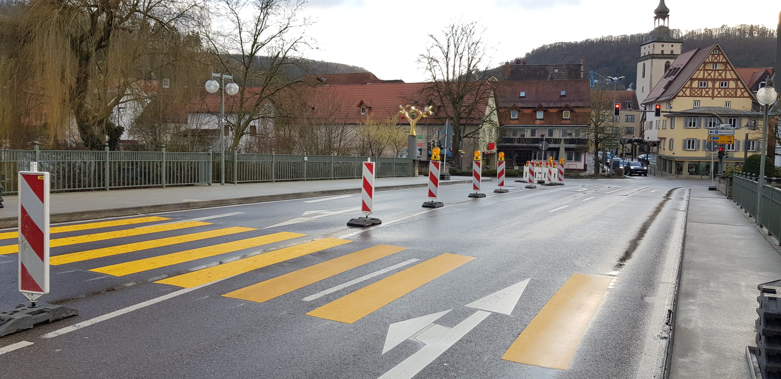 Ein Zebrastreifen mitten auf der Kocherbrücke gewährt Fußgängern sicheres Passieren der Baustelle.Foto: Stadtverwaltung Künzelsau