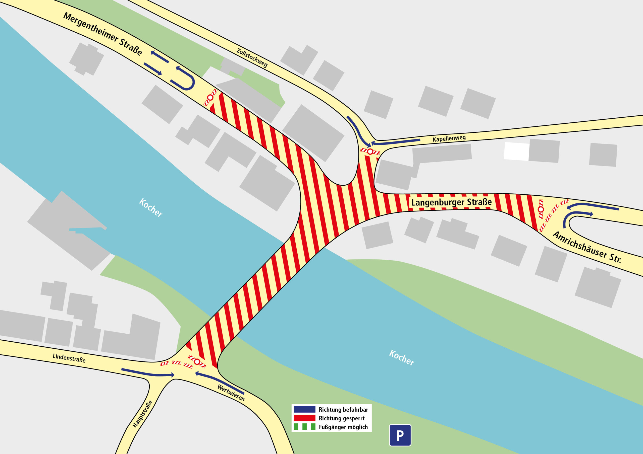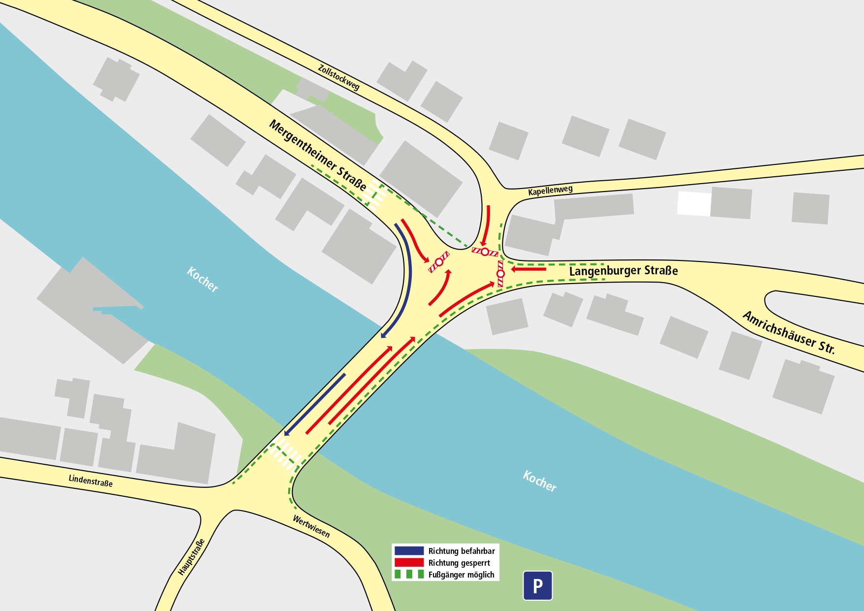 Während der dritten Bauphase vom 21. März bis voraussichtlich 20. Mai 2022 wird die Kocherbrücke halbseitig stadteinwärts gesperrt. Alle anderen Fahrtrichtungen sind dann wieder freigegeben. Die beiden Aral-Tankstellen, Tiemann Grafik Hohenlohe KG und das Autohaus Kunze sind über die Mergentheimer Straße aus anfahrbar.