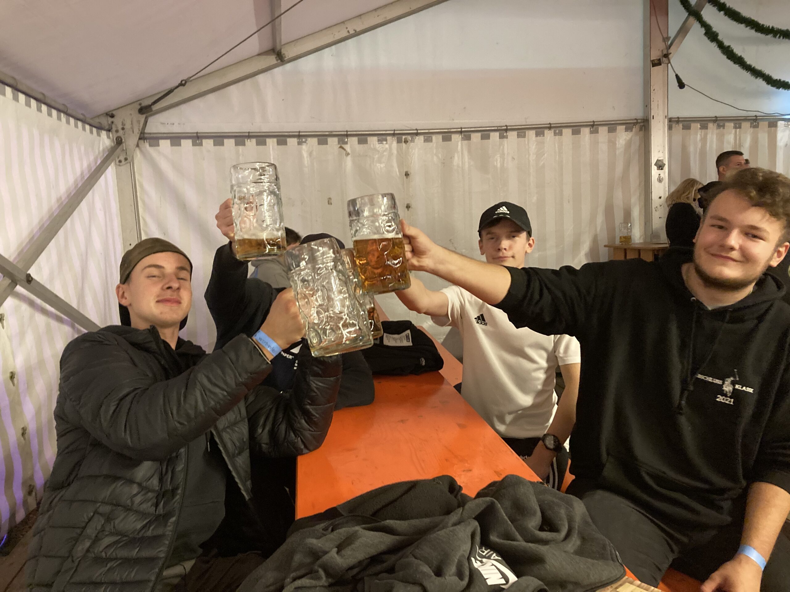 Das finden auch Yannik Müller, Niko Chartomatsidis, Daniel Franz, Lukas Fiala, Theresa Bürkert, Thilo Kempf, Marcel Fahrbach, Fabian und Toni Kühlerwei, Marc Zeller, Klaus Zwei und Jürgen Lorenz. Die Arbeitskollegen sind gemeinsam aus Forchtenberg auf die Wert Wies’n gekommen und sind derart angetan von der ausgelassenen Stimmung, dass sie das Interview selbst in die Hand nehmen und Stichpunkte aufschreiben. Für sie sind „aus Kollegen Freunde geworden“.