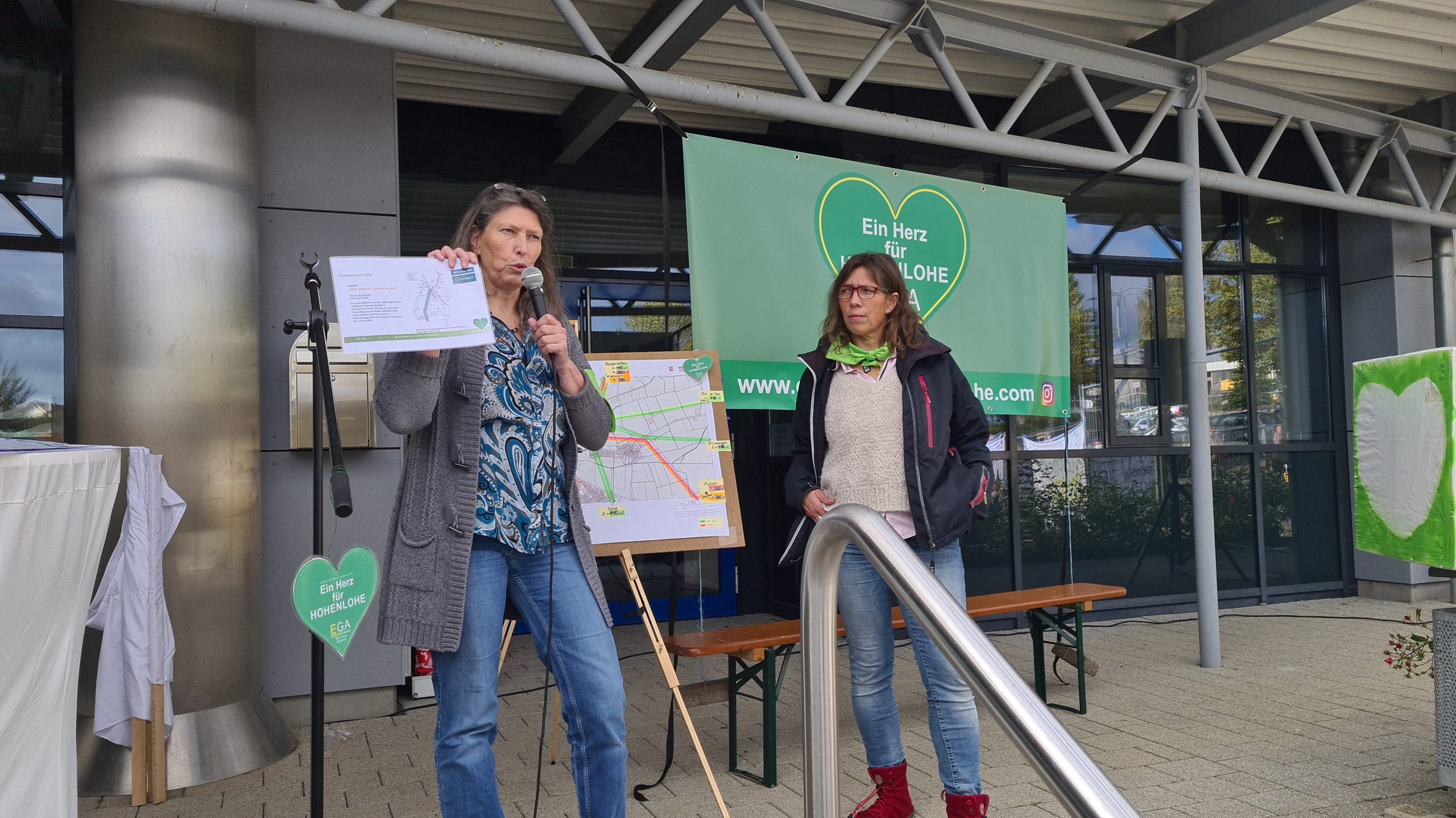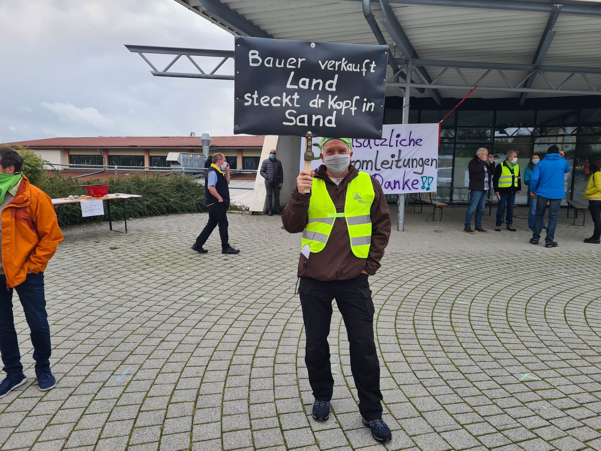 „Profitgier auf Bürgerkosten – nicht mit uns.“ Heidegret Mayer von der Schutzgemeinschaft ländlicher Raum Hohenlohe wählt Worte der Hoffnung: „Hohenlohe ist groß. Wir sind kein Ballungsraum, ich glaube, das ist unser Problem. Die in Stuttgart oder Berlin denken: ‚Das sind bloß so ein paar hintendrum, mit denen kann man das machen‘. Aber ich denke, wenn wir durchhalten, wenn wir zusammenstehen, als Menschen, die hier zusammen leben, als Menschen, die wissen, wie wunderschön das hier ist und wie bedroht es ist, wie gefährdet es ist, dann werden wir auch so eine Gefahr wie euren Netzbooster abwenden.“ Als Mayer der Menge zuruft „Wir müssen jetzt zwar Maulkorb tragen, aber wir lassen uns den Mund nicht verbieten“, antworten die Menschen mit tosendem Applaus.