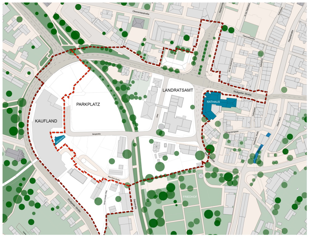 So ist vonseiten des Kreises kein einhäusiges Landratsamt mehr gewünscht, sondern ein „modulares System“ angedacht, das aus mehreren Gebäuden bedarfsgerecht aufgebaut werden kann. Das zentrale Gebäude soll auf dem heutigen Schotterparkplatz am Kaufland errichtet werden, zwei weitere Gebäude sind östlich davon an der neuen Stadtachse Richtung Rathaus geplant. Auf dem nördlichen Teil des heutigen Schotterparkplatz soll ein Parkhaus für etwa 250 Fahrzeuge errichtet werden. Dieser Teil der Umgestaltung könnte, so Tritschler bereits bis Ende 2023 realisiert sein, sofern der notwendige Bebauungsplan schnell verabschiedet werden kann. In einer späteren Bauphase sollen dann die heutigen Gebäude des Landratsamtes abgerissen und dort ein neues repräsentatives Gebäude errichtet werden. Die weiteren Baumassnahmen, inklusive eines eventuellen Neubaus des Kaufland-Gebäudes werden voraussichtlich mindestens bis 2030 dauern.