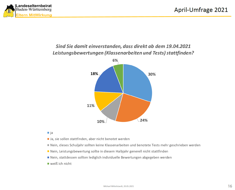 Dem gegenüber steht die Sicht der meisten Eltern. In einer Umfrage, an der sich im April 2021 rund 130.000 Eltern beteiligten, hatte der Landeselternbeirat gefragt, ob sie einverstanden seien, dass unmittelbar ab dem 19. April 2021 Leistungsabfragen – also Klassenarbeiten und Tests – stattfinden sollen. 30 Prozent bejahten diese Frage ganz klar, 24 Prozent waren zwar für die Leistungsabfragen, diese sollten ihrer Meinung nach allerdings nicht benotet werden. Nur zehn Prozent der Eltern waren strikt gegen Klassenarbeiten und Tests in diesem Schuljahr.