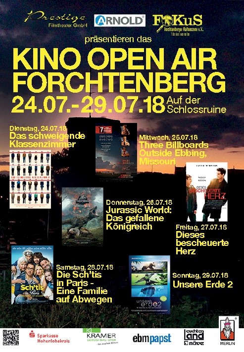 Vom 24. Juli bis zum 29. Juli 2018 veranstalten das Prestige Filmtheater und FoKuS e.V. (Forchtenberger Kulturszene Verein) auf der Schlossruine in Forchtenberg wieder das alljährliche Open-Air Kino mit zirka 800 Sitzplätzen. Der Einlass ist ab 19 Uhr und der Filmbeginn ab zirka 21.30 Uhr. An verschiedenen Verkaufsständen bieten die Veranstalter alkoholische und nicht alkoholische Getränke, warmes Essen, sowie Popcorn, Eis und Chips an.