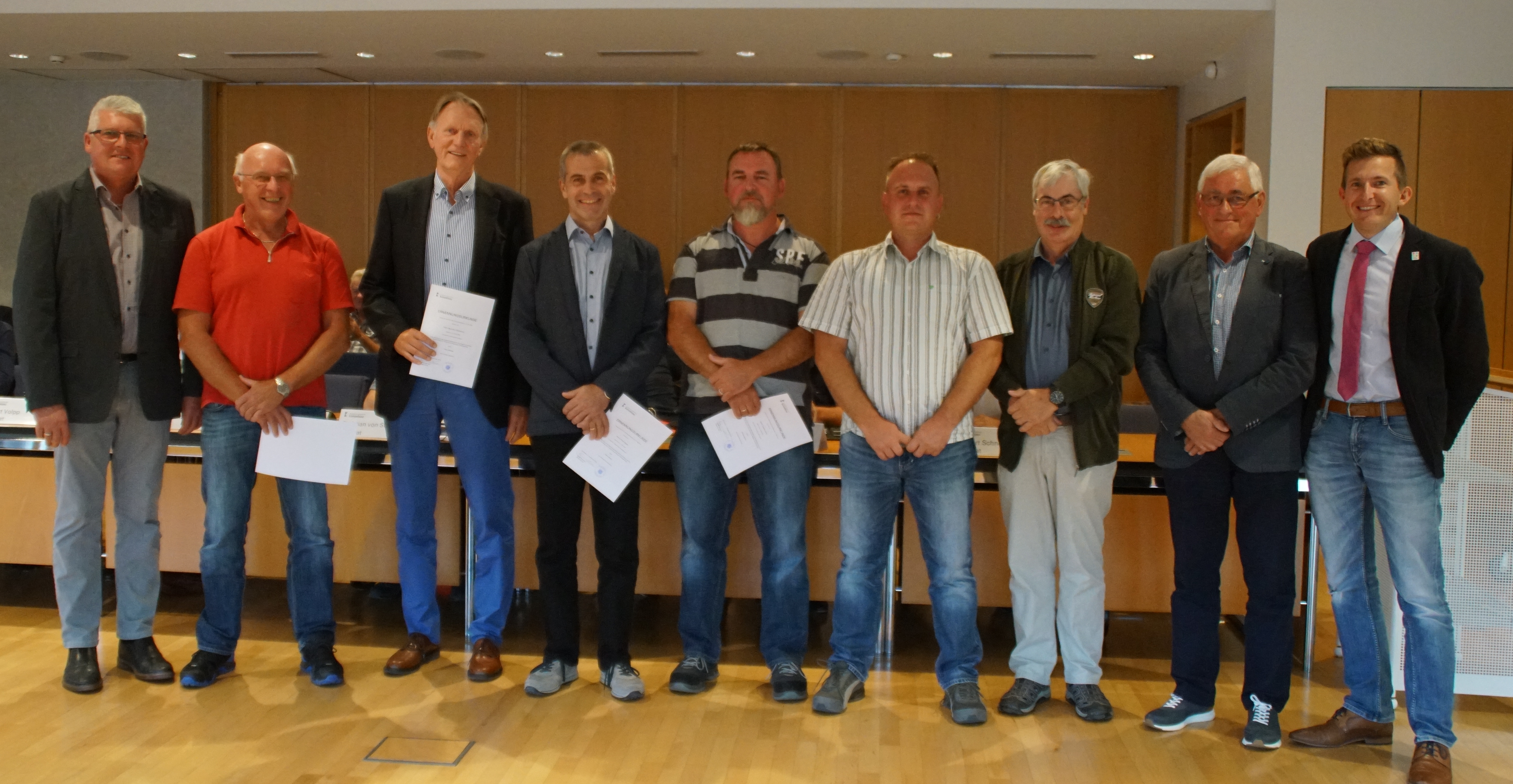 Verpflichtet, v.l.: Die Ortsvorsteher Ralf Markert, Ernst Baudermann, Bernhard Kürschner, Frank Egner, Carsten Zeller, Felix Bittner, Jochen Jäger, Gerhard Rudolph und Bürgermeister Stefan Neumann. Foto: Stadtverwaltung Künzelsau