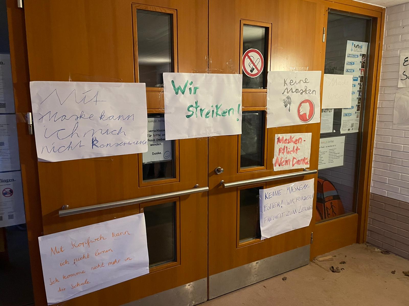 „Wir streiken!“, steht auf einem Plakat. Auf anderen: „Mit Maske kann ich mich nicht konzentrieren“ oder „Mit Kopfweh kann ich nicht lernen, ich komme nicht mehr in die Schule“. Diese und viele weitere Plakate haben vor kurzem einige Eltern, eine Oma und mehrere Kinder in einer spontanen Aktion im Eingangsbereich der Zweiflinger Grundschule aufgehängt. Sie wollten damit gegen die Maskenpflicht im Unterricht protestieren, die seit Montag, den 22. März 2021, auch für die Schüler an Baden-Württembergs Grundschulen gilt, und darauf aufmerksam machen, was sie überhaupt für die Kinder bedeutet. Sie wollten „die anderen Mütter aufwecken und ermutigen“. Zuvor mussten Grundschüler die Masken in der Schule lediglich dann tragen, wenn sie von ihrem Platz aufstehen wollten. Die Plakate wurden jedoch kurz danach vonseiten der Schule und der Gemeindeverwaltung, nachdem die Eltern die Schule verlassen hatten, wieder abgehängt.