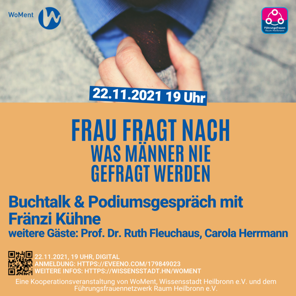 Das Karriereförderprogramm WoMent der Hochschule Heilbronn veranstaltet in Kooperation mit den Führungsfrauen Raum Heilbronn e.V. eine digitale Talkrunde mit Fränzi Kühne. Die Autorin, Speakerin und Unternehmerin spricht am Montag, den 22. November 2021, ab 19 Uhr über ihr aktuell viel diskutierten Buch „Was Männer nie gefragt werden“. Weitere Gäste des Abends sind Prof. Dr. Ruth Fleuchaus, Prorektorin für Internationales und Diversität der Hochschule Heilbronn, sowie Carola Herrmann, Leiterin Organizational Development bei Lidl Stiftung & Co. KG und Sprecherin der AG Nachwuchsförderung der Führungsfrauen Raum Heilbronn e.V.