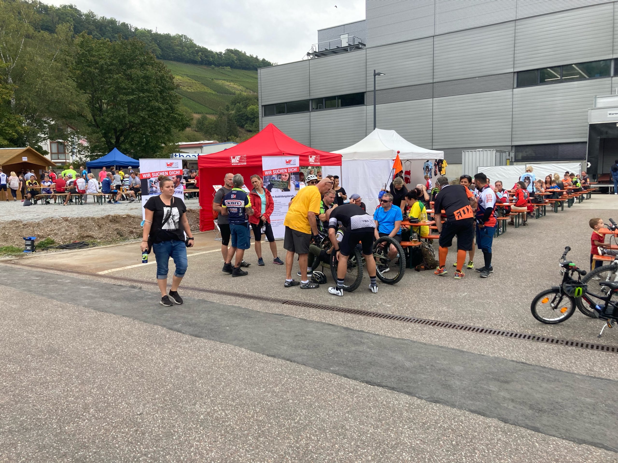 Aus begeisterten Radsportlern und Kollegen besteht die Gruppe von WE-Eisos, die sich auf der Strecke gesammelt haben. „Wir sind die 40 Kilometer gefahren und haben den Track besiegt.“ Aber ganz freiwillig war die „Siegergruppe“, wie sie sich selbst nennen, nicht dabei. „Wir sind gezwungenermaßen mitgefahren auf Zwang unserer Kollegen hier.“ Dennoch kamen sie aus dem Schwärmen nicht heraus. „Die Strecke war mega-klasse. Es war wunderschön zu fahren und das Wetter hätte besser nicht sein können. Am besten war aber die Stelle am Jagstberg. Dort sind uns auch viele nette Helfer begegnet – unter anderem die freiwillige Feuerwehr.“ Insgesamt waren an den verschiedenen Verpflegungsstationen und auf dem Firmenhof über 50 Helfer aus den eigenen Reihen des Unternehmens unterwegs.