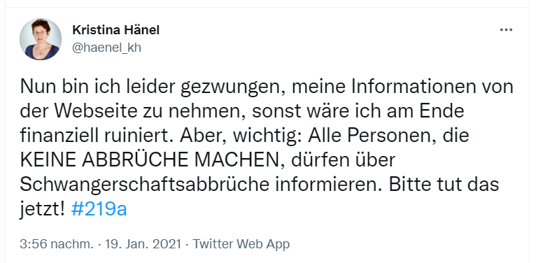 Dem Thema „Reproduktive Selbstbestimmung“ hat die Ampel ungefähr eine von rund 170 Seiten gewidmet. Die klarste Aussage ist: „Ärztinnen und Ärzte sollen öffentliche Informationen über Schwangerschaftsabbrüche bereitstellen können, ohne eine Strafverfolgung befürchten zu müssen. Daher streichen wir § 219a StGB.“ Der §129a StGB stellt bis jetzt die Werbung für Schwangerschaftsabbrüche unter Strafe, wenn damit ein Vermögensvorteil erzielt werden soll oder die Werbung in „grob anstößiger Weise“ erfolgt. Wenn die Webseite einer Arztpraxis die unterschiedlichen Methoden für einen Abbruch sachlich beschreibt, kann das schon strafbar sein. Dies mußte die Gießener Ärztin Kristina Hänel erfahren – eine Geldstrafe von 2.500 Euro wurde unlängst höchstrichterlich bestätigt – denn als Ärztin, die Abbrüche durchführt, erzielt sie einen Vermögensvorteil.