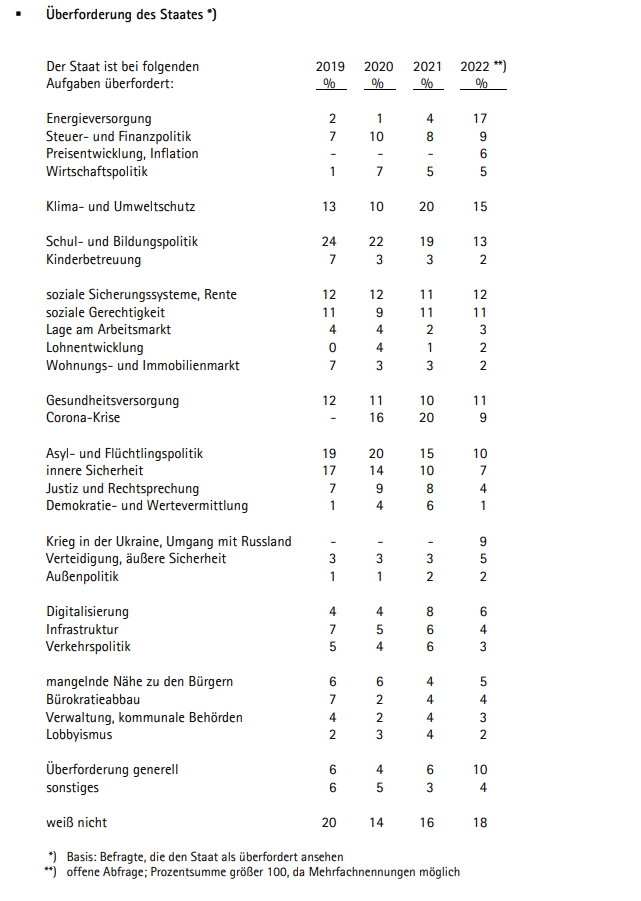 Diese Bewertungen wollen so gar nicht zum Ergebnis passen, dass nur noch 29 Prozent der Befragten den Staat für handlungsfähig halten und 66 Prozent ihn für überfordert halten. Man sollte eine deutlich schlechtere Bewertung annehmen: Wenn 66 Prozent die Leistung der staatlichen Institutionen nicht als „ausreichend“ erachten, kann die Gesamtwertung eigentlich keine 3minus mehr sein.