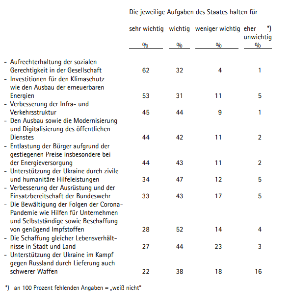 Welche staatlichen Aufgaben die Bürger für wichtig oder weniger wichtig halten, ist die letzte Aussage der Umfrage: Und wieder stehen die sozialen Themen und der Klimaschutz an erster Stelle: 94 Prozent der Bevölkerung halten die Aufrechterhaltung der sozialen Gerechtigkeit für wichtig oder sehr wichtig, beim Klimaschutz sind es 84 Prozent. Auch die Entlastung der Bürger aufgrund der Inflation (87 Prozent) ist im Endeffekt nichts anderes als das Thema der sozialen Gerechtigkeit.