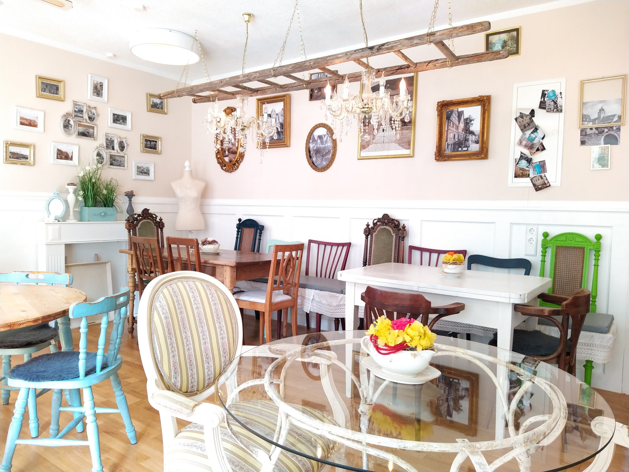 Wer im Stadt Café drinnen sitzen möchte – beispielsweise unter der alten Leiter mit den Kronleuchtern oder auf dem grünen Samtsofa – muss über eins der drei G verfügen: genesen, geimpft oder getestet sein. Was eigentlich den Vorstellungen der gelernten Hotelfachfrau widerspricht: „Ich wollte keine Zielgruppe, zu uns sollte jeder kommen dürfen.“ Wegen der Corona-Verordnung musste sie allerdings schon Leute wieder wegschicken, denen nicht bewusst war, dass sie einen negativen Corona-Test brauchen. So kann sie knapp 30 Personen in ihren Gasträumen empfangen. Etwas anders sieht es auf ihrer großen Terrasse aus: Hier dürfen die Gäste mittlerweile ohne Test Platz nehmen. Und hier gibt es auch keine behördliche Grenze hinsichtlich der Anzahl. Allerdings müssen alle, die durch die Räume laufen, eine Maske tragen – natürlich auch die Bedienungen.
