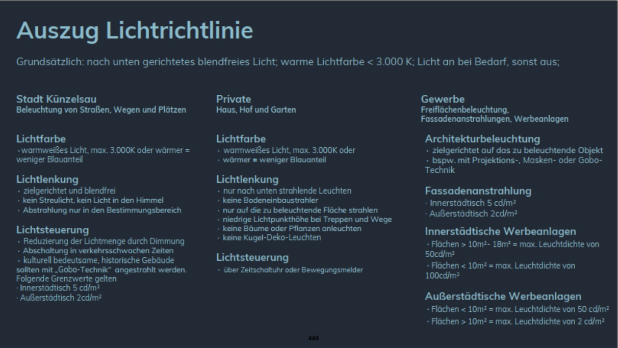 Auf dieser Basis hat Nowicki eine „Lichtrichtlinie“ für Künzelsau erarbeitet, die der Stadt Künzelsau, privaten Hauseigentümern und dem Gewerbe eine Leitlinie für Beleuchtung im Außenbereich an die Hand gibt. In zukünftige Bebauungspläne soll diese Richtlinie als Bedingung mit aufgenommen werden: