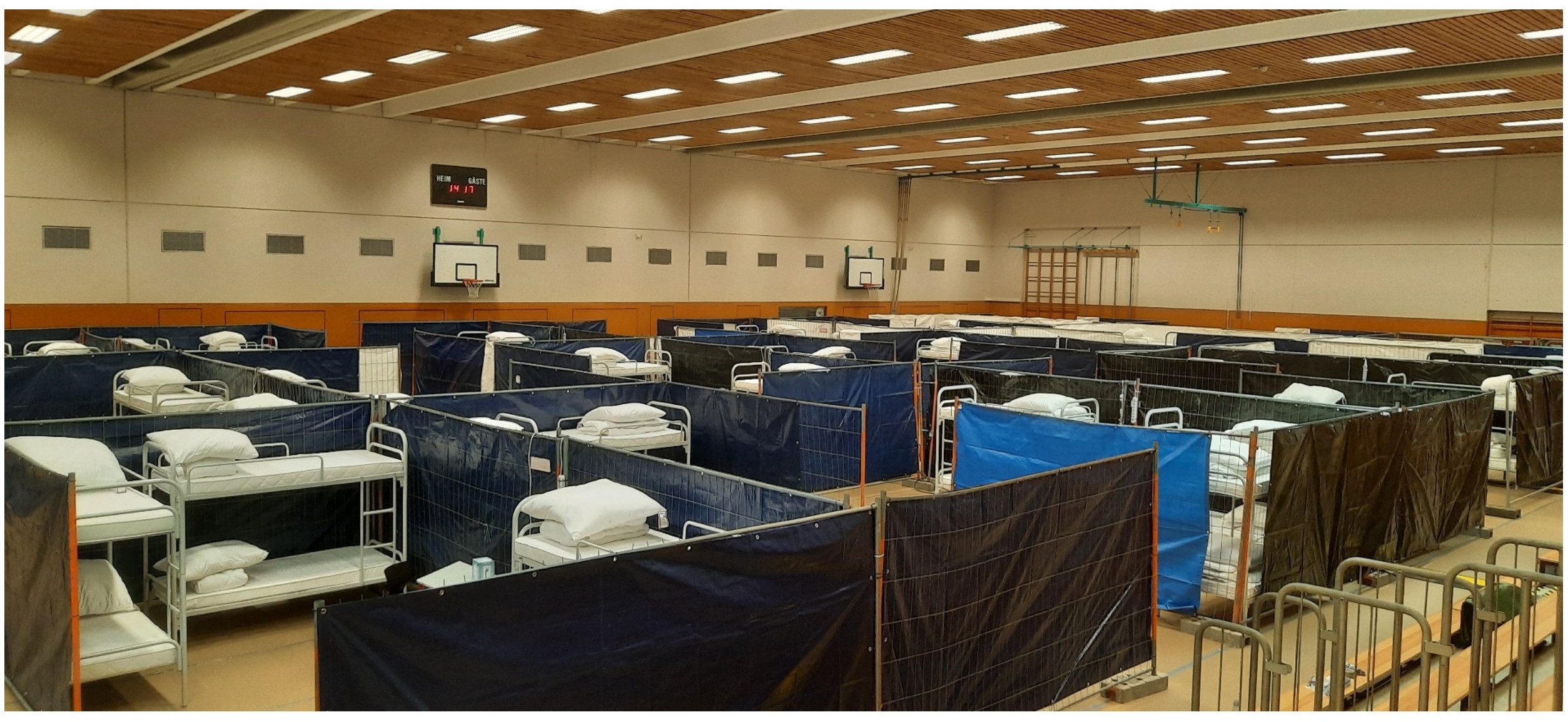 Das Krankenhaus mit seinen einzelnen Zimmern bietet eine angemessene Privatsphäre – in der Eberhard-Gienger-Halle ist die schon schwieriger zu realisieren. Abtrennungen und Sichtschutz sind aber auch dort installiert worden. Allerdings ist die Halle als reine Notunterkunft nicht so gut ausgestattet wie im Krankenhaus, es gibt beispielsweise keine individuellen Kochstellen, sondern eine Feldküche.