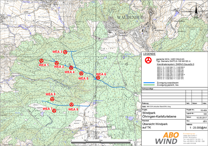 | Über ABO Wind: ABO Wind entwickelt und errichtet erfolgreich Wind– und Solarparks. Das 1996 gegründete Unternehmen aus Wiesbaden hat bislang Anlagen mit 3.800 Megawatt Leistung umgesetzt und rund die Hälfte davon errichtet. Das jährliche Investitionsvolumen beträgt 500 Millionen Euro. Mehr als 900 Mitarbeiterinnen und Mitarbeiter in 16 Ländern arbeiten mit Elan an der Planung, Finanzierung, Errichtung, Betriebsführung und am Service von Anlagen für eine zukunftsfähige Energieversorgung. Infos zum Windpark finden sich unter: www.windpark–oehringen–karlsfurtebene.de (Seite der AboWind) |