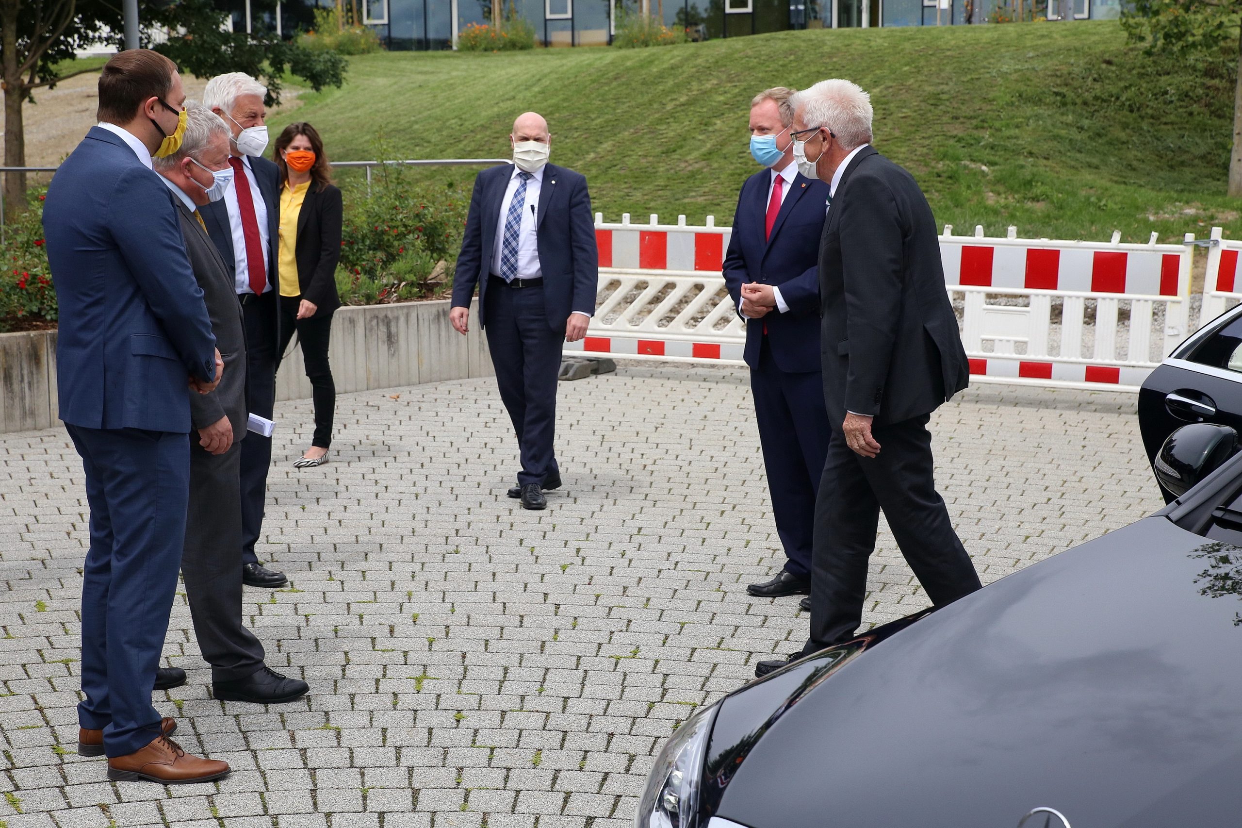 Völlig unbeeindruckt von der Ankunft des Ministerpräsidenten Winfried Kretschmann zeigten sich am Freitag, 19. Juni 2020 nur die Bauarbeiter an der Kupferzeller Carl-Julius-Weber-Halle. Alle anderen warten gespannt auf die Ankunft des Ministerpräsidenten.