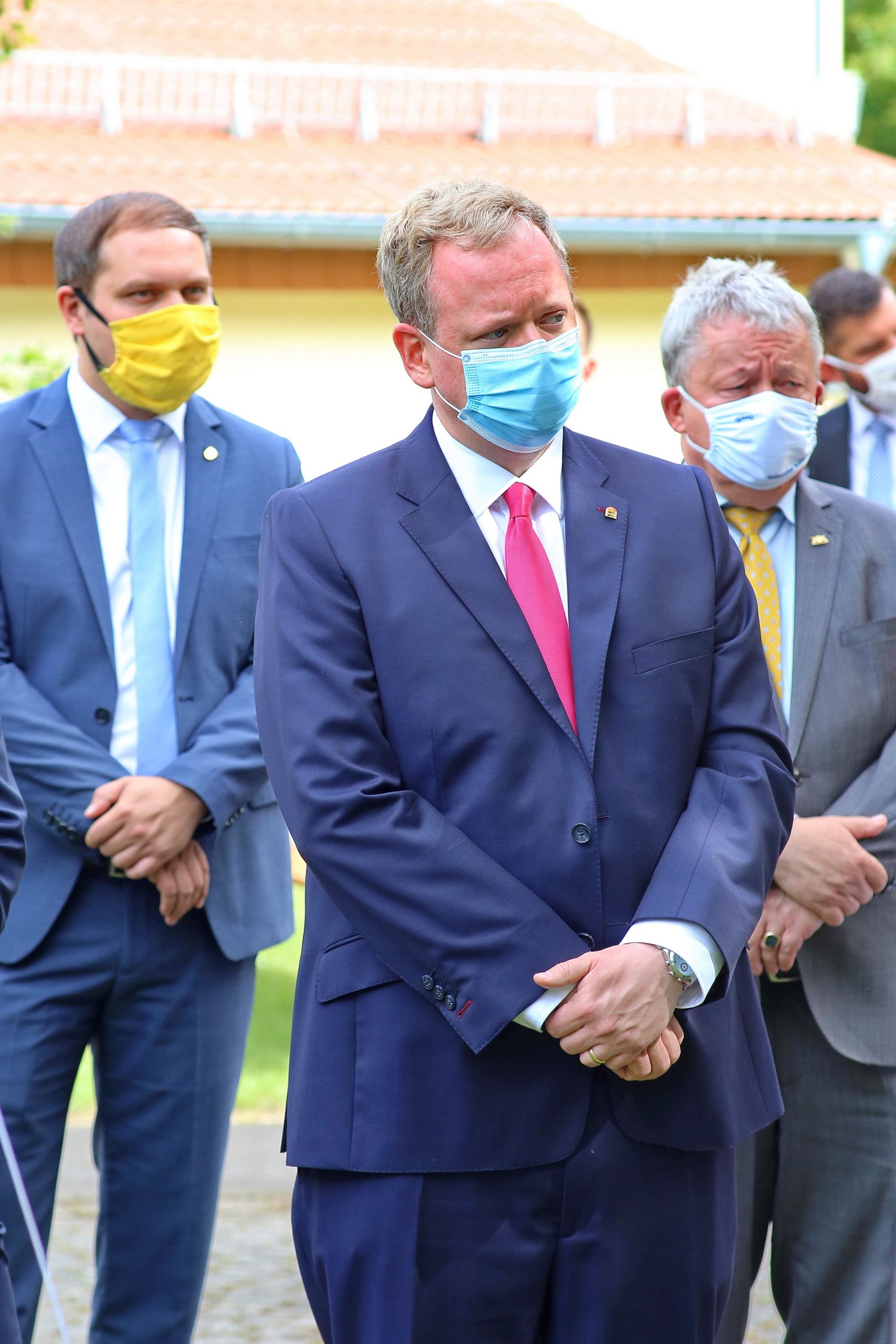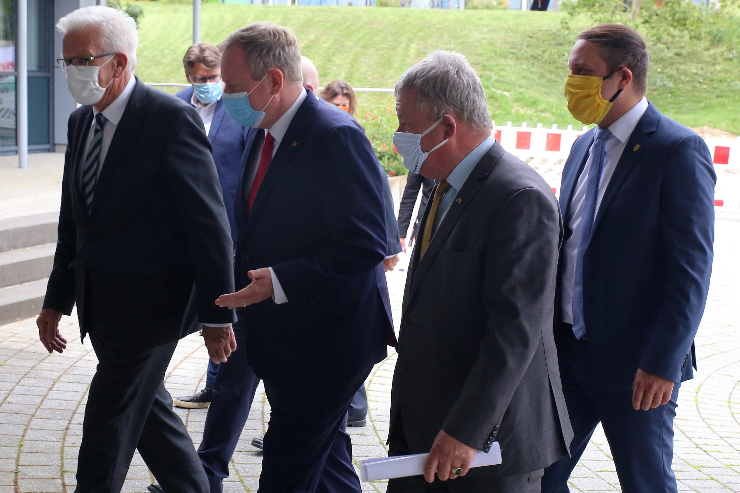 Waldenburg Bürgermeister Markus Knobel (links) und Winfried Kretschmann mit präsidialem Mundschutz, im Hintergrund die beiden Landtagsabgeordneten des Hohenlohekreises Anton Baron (AfD) und Arnulf von Eyb (CDU). Foto: GSCHWÄTZ