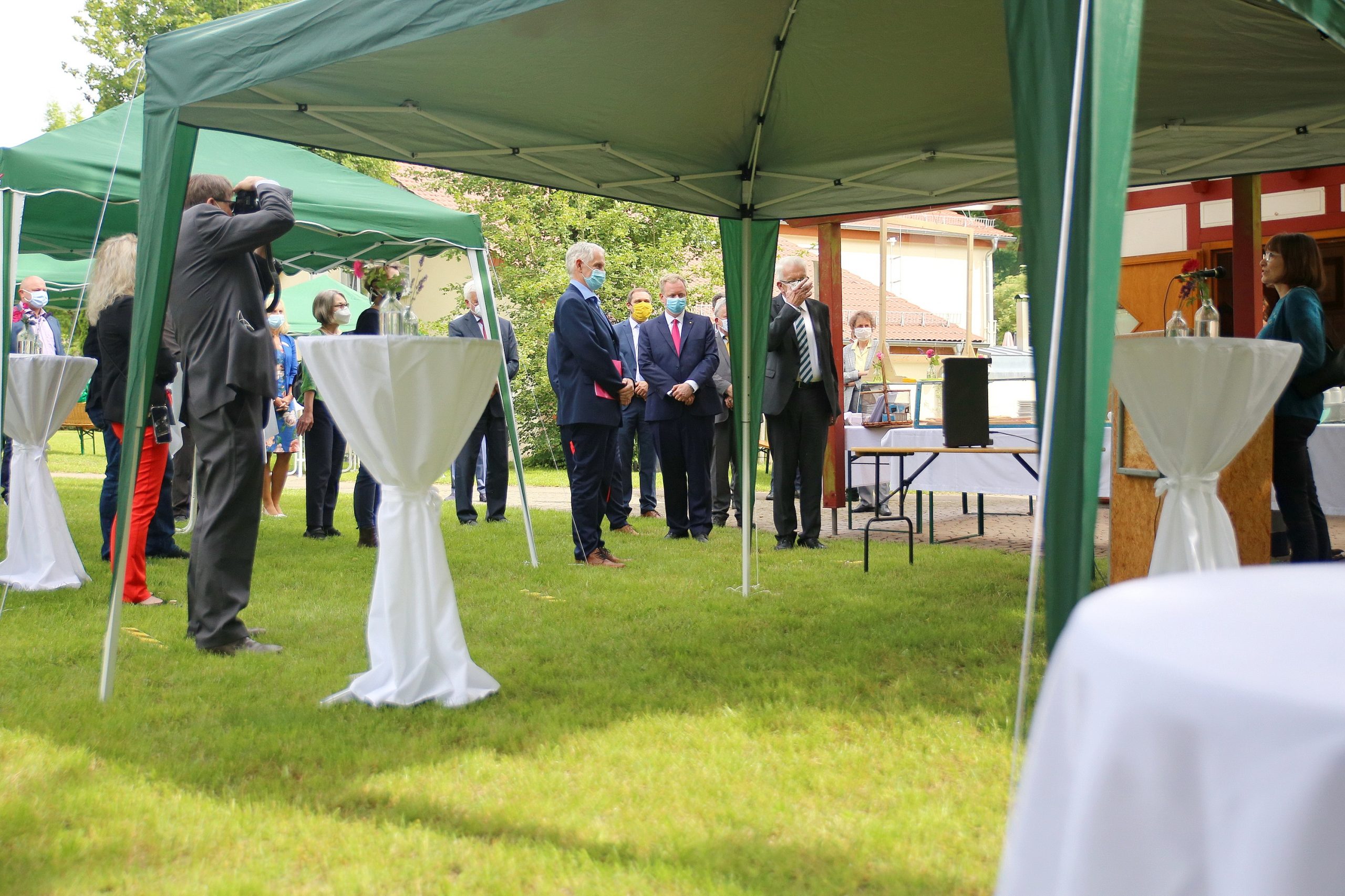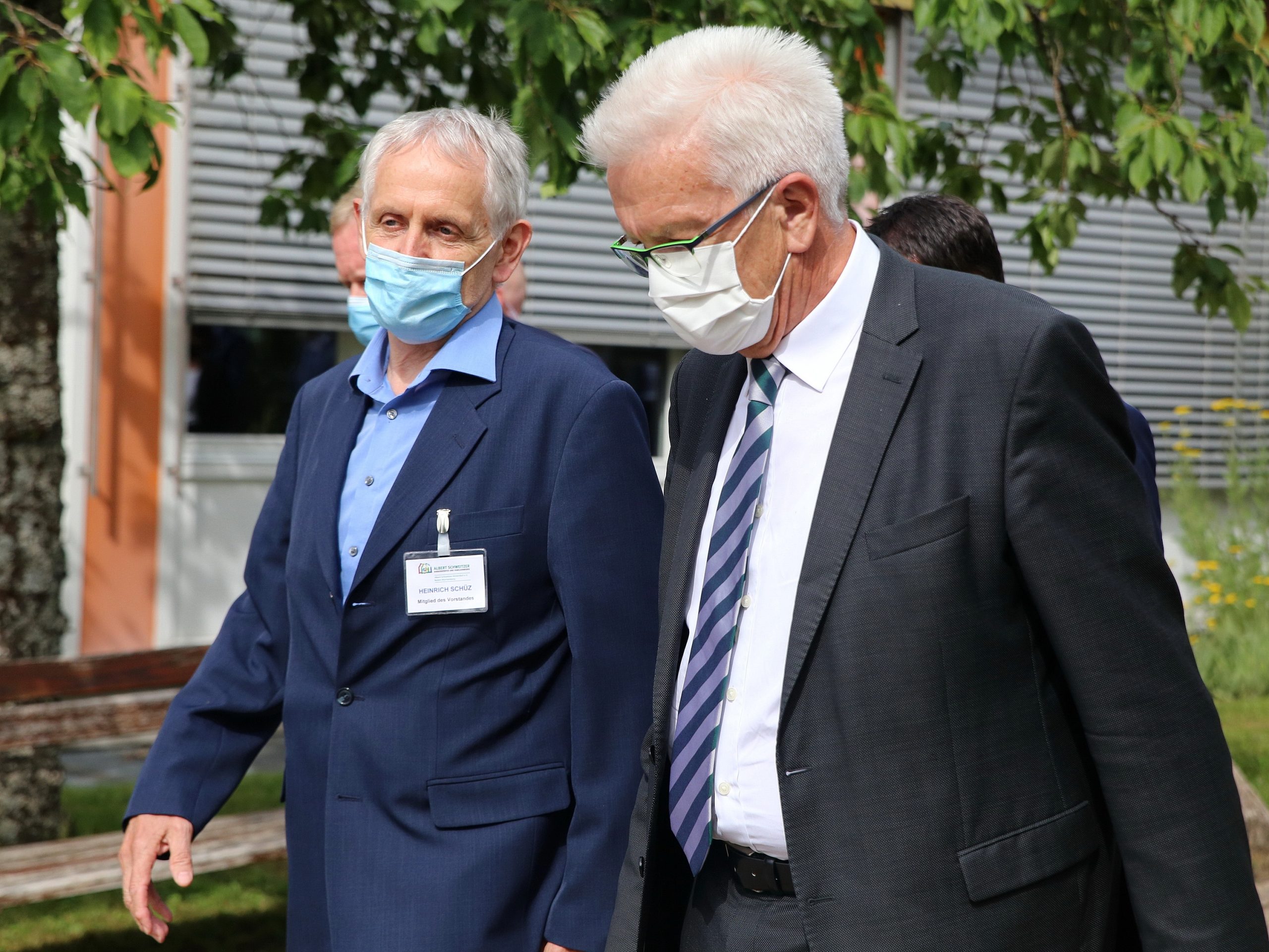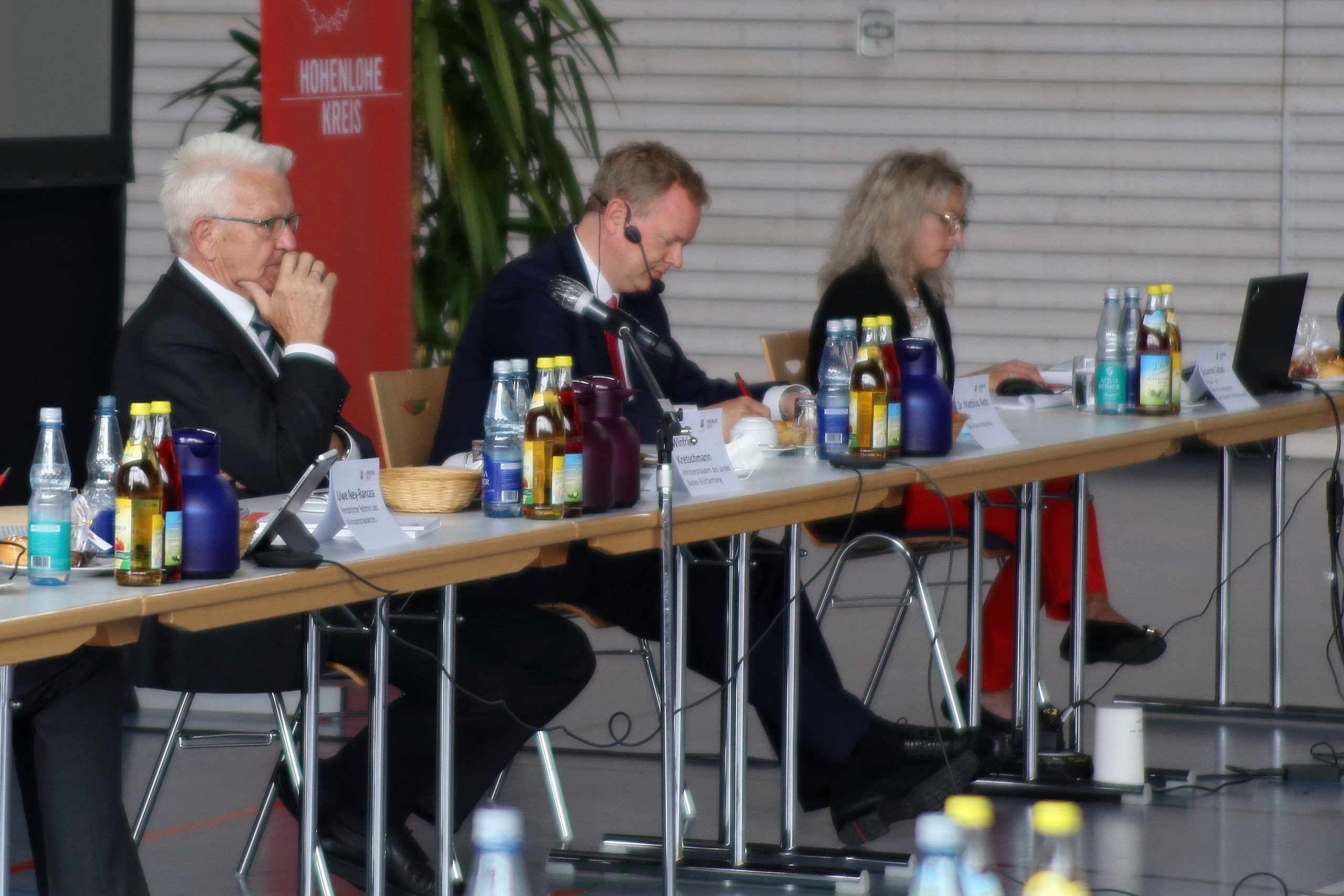 Landrat Dr.Matthias Neth entschuldigte sich bei Kretschmann für das Corona-bedingte Fehlen der obligatorischen Blaskapelle, bevor er ihn, begleitet von den Hohenloher Landtagsabgeordneten Arnulf von Eyb (CDU) und Anton Baron (AfD) in die Halle führte. Dort fand ein kommunalpolitisches Gespräch mit politischen Mandatsträgern und Beamten aus dem Hohenlohekreis statt.