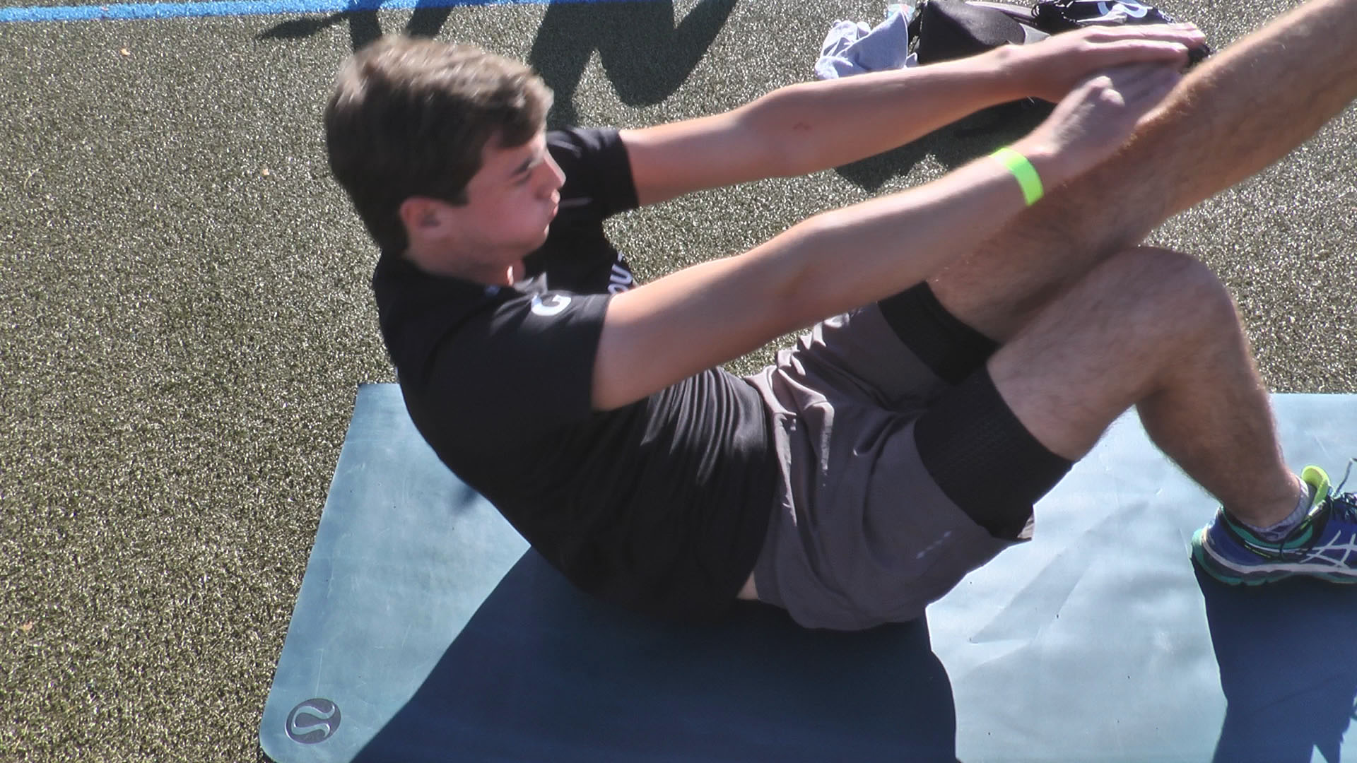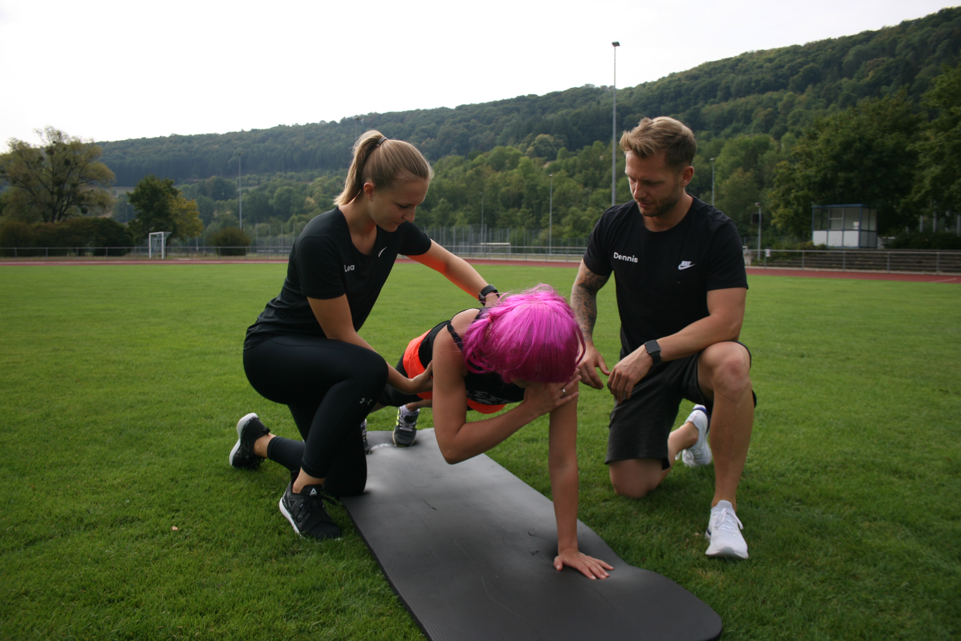 Unsere Praktikantin Wendy merkt beim Workout sehr schnell, wo ihre Grenzen und Schwachstellen sind. Der Rücken scheint durchzubrechen, ein Zeichen von viel Büroarbeit und wenig Rückenmuskulatur, vor allem im unteren Rückenbereich, wie Dennis Göller erklärt.